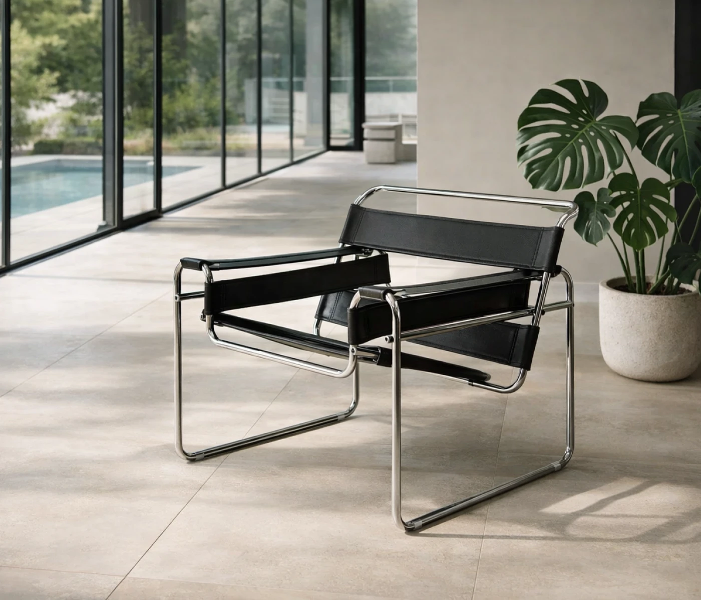Der Wassily Chair entstand während Marcel Breuers Zeit am Bauhaus. Inspiriert vom gebogenen Stahlrohr seines Fahrrads entwickelte Breuer die Idee, Möbel aus industriell gefertigten Stahlrohren zu bauen – leicht, stabil und seriell produzierbar. Das Ergebnis war ein radikal neues Möbelkonzept: ein freitragender Rahmen aus verchromtem Stahl, kombiniert mit gespannten Leder- oder Canvasflächen als Sitz, Rücken und Armlehnen. Der ursprüngliche Name lautete Modell B3. Erst später wurde der Sessel nach Wassily Kandinsky benannt, der am Bauhaus arbeitete und eine frühe Version des Stuhls besaß. Heute steht der Wassily Chair exemplarisch für die Bauhaus-Maxime: Form folgt Funktion. Seine minimalistische Konstruktion wirkt bis heute erstaunlich modern.